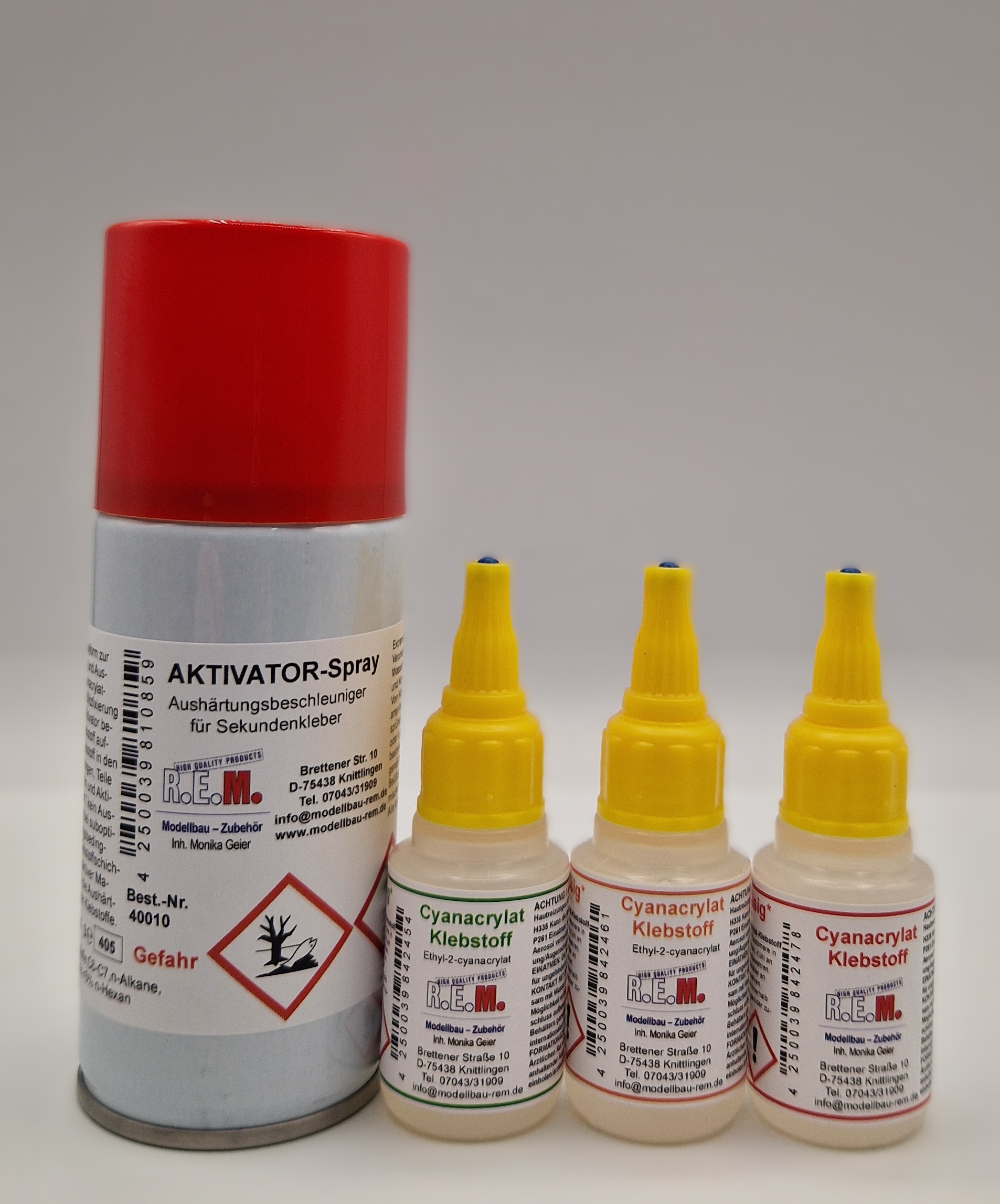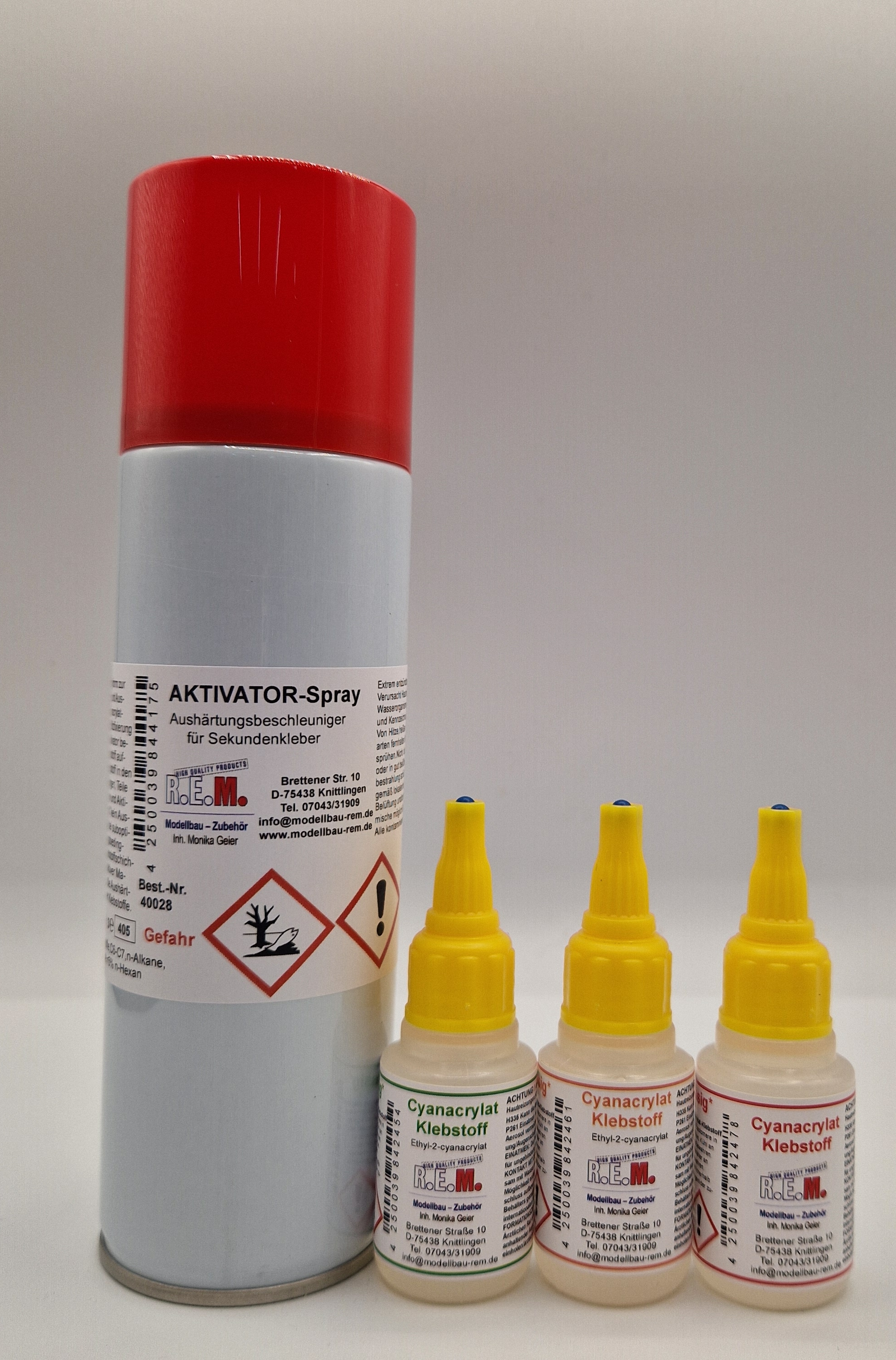 ![]() | 040000 | | Klebeset klein Zusatzinfo: Inhalt: 1 x Aktivator-Spray 150 ml / Art.Nr. 40010 1 x Cyano-Sekundenkleber dünn / Art.Nr. 40396 1 x Cyano-Sekundenkleber mittel / Art.Nr. 40397 1 x Cyano-Sekundenkleber dick / Art.Nr. 40398 |