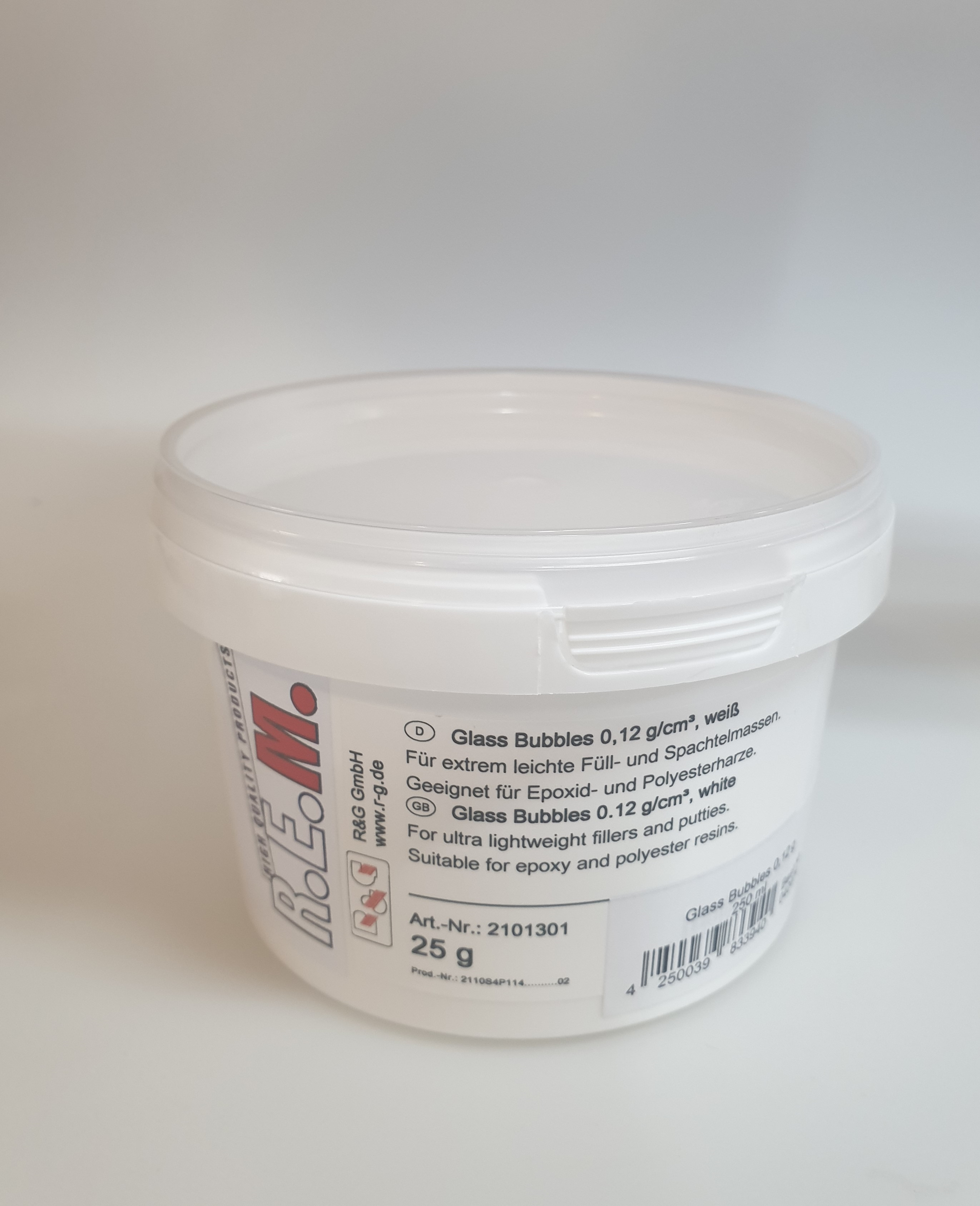 ![]() | 040404 | | Glass Bubbles 0,12 g / 125 ml / 15 g Dose Zusatzinfo: Glass Bubbles sind Mikroglashohlkugeln und bestehen aus einem wasserunlöslichen, chemisch stabilen und alkaliarmen Borosilikatglas. Leichtfüllstoff zum Anmischen von Leichtspachteln, Klebern und Pressmassen. Erhöht die Schlagzähigkeit und Druckfestigkeit der Formmassen. |